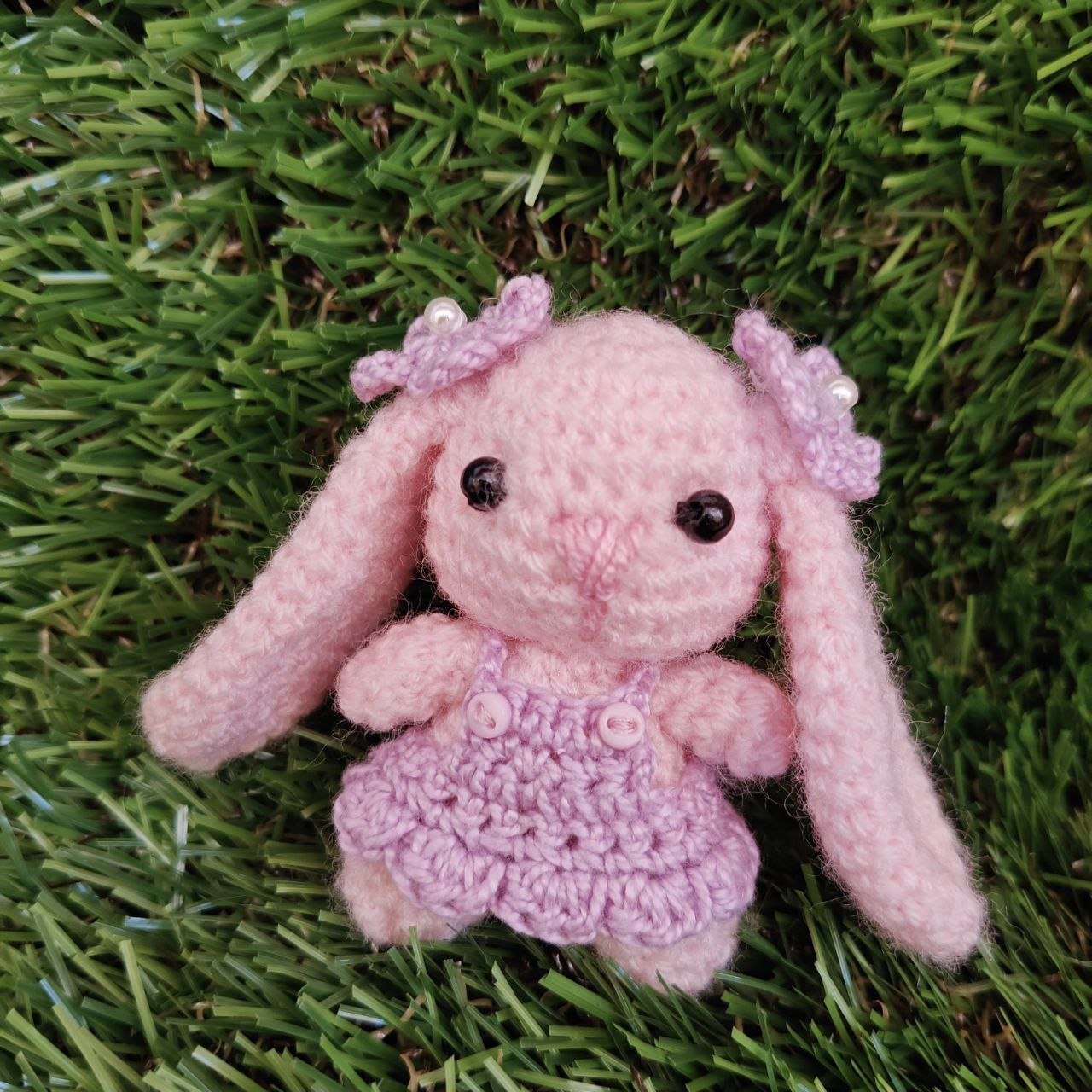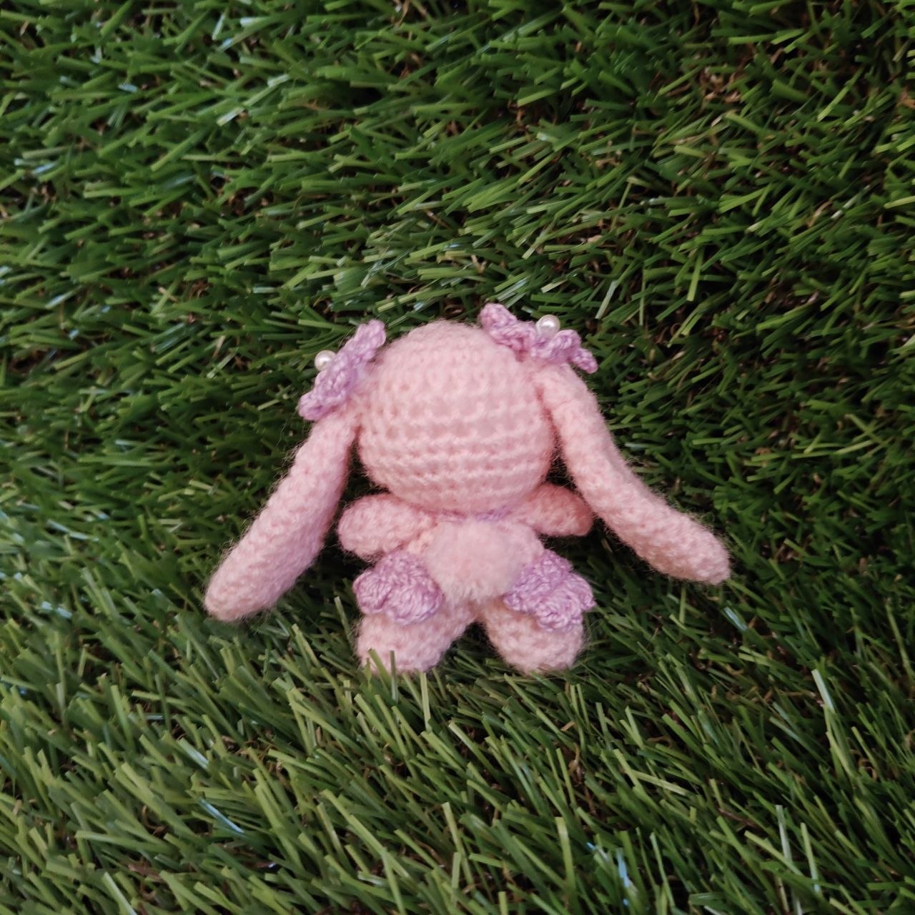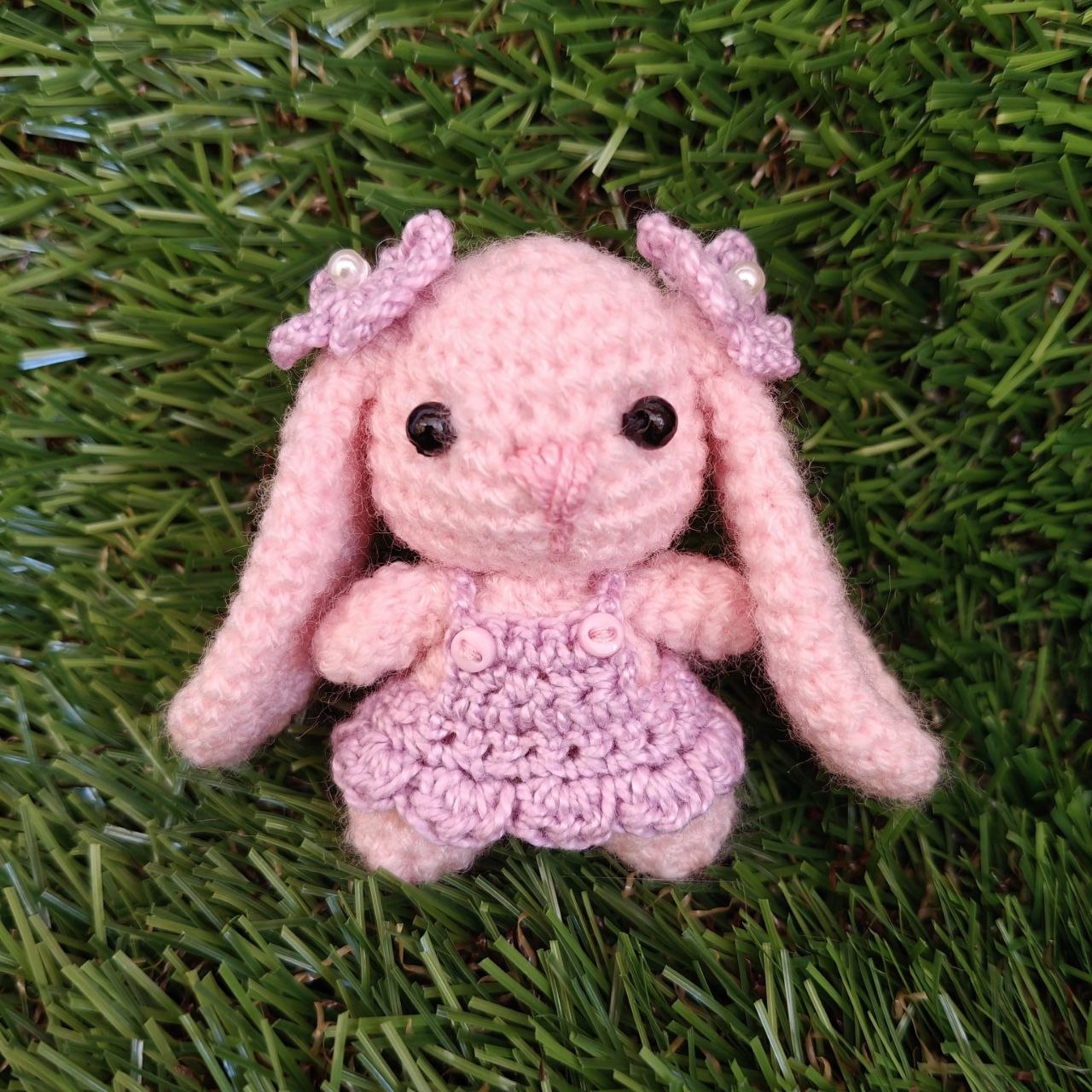 Conejita amigurumi rosa pastel con vestido lila y flores en orejas.