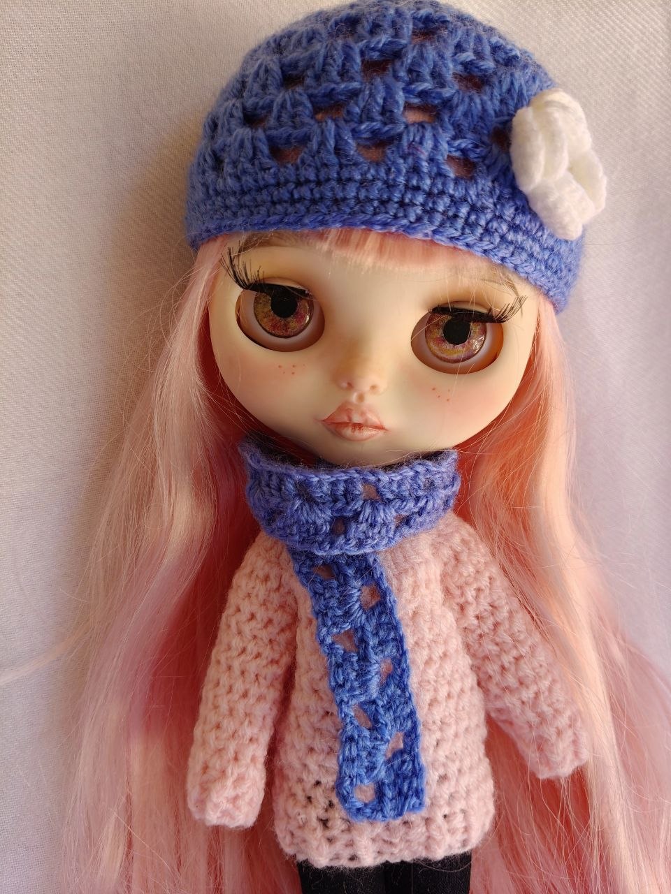 Hecho a mano en crochet. Precioso conjunto de gorro y bufanda de lana en crochet, decorado con una pequeña rosa, para muñeca Blythe y Pullip. Varios colores a elegir. 12 euros cada conjunto, un conjunto de cada color.