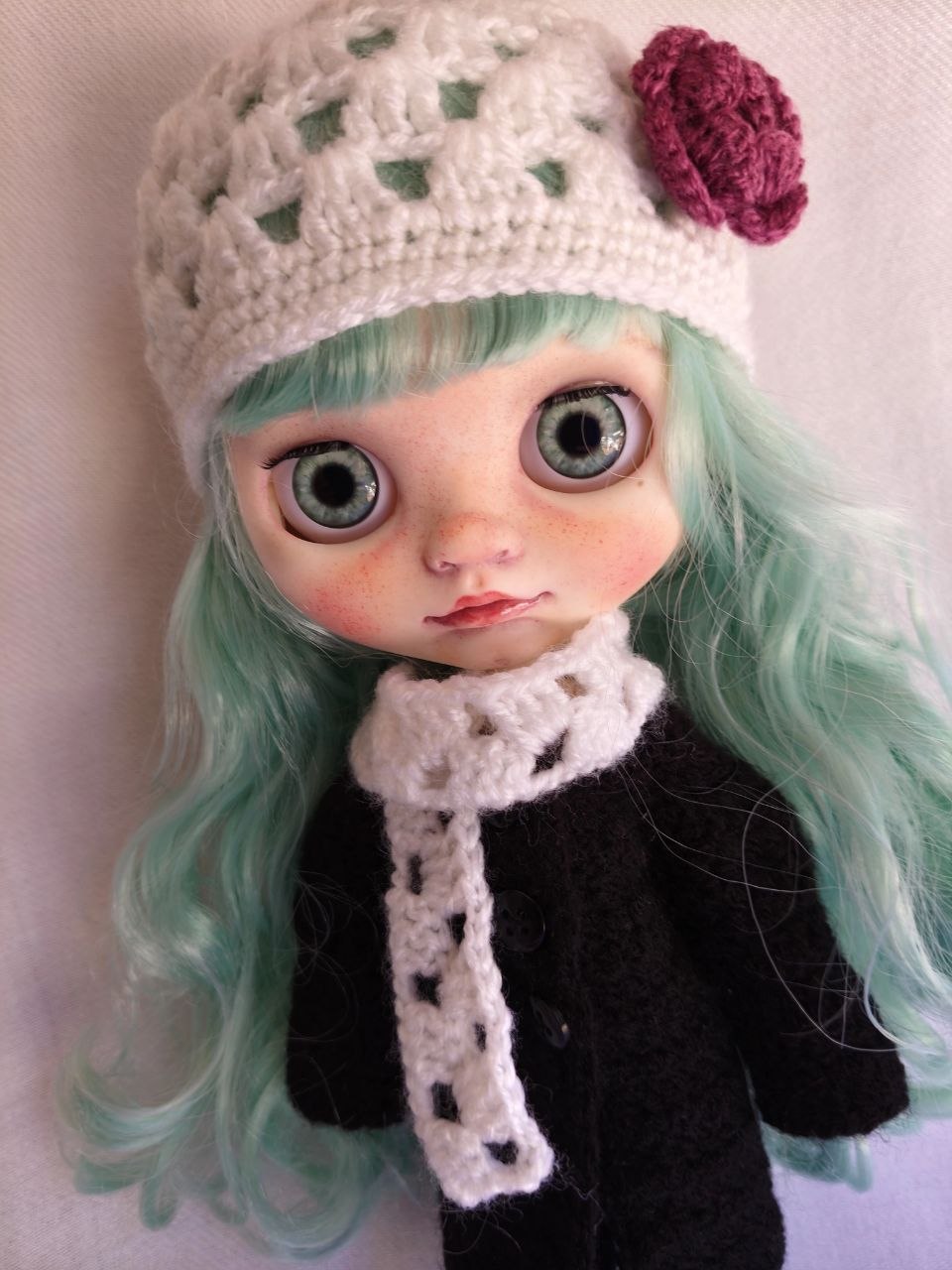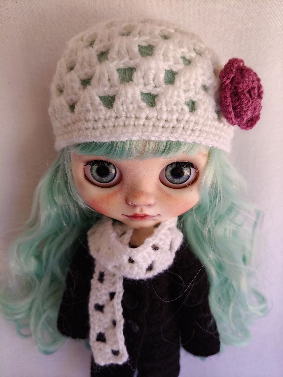 Hecho a mano en crochet. Precioso conjunto de gorro y bufanda de lana en crochet, decorado con una pequeña rosa, para muñeca Blythe y Pullip varios colores a elegir.