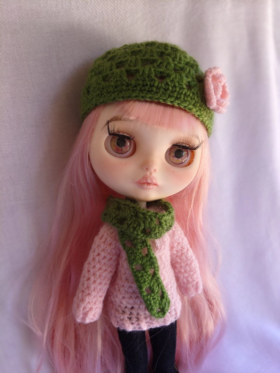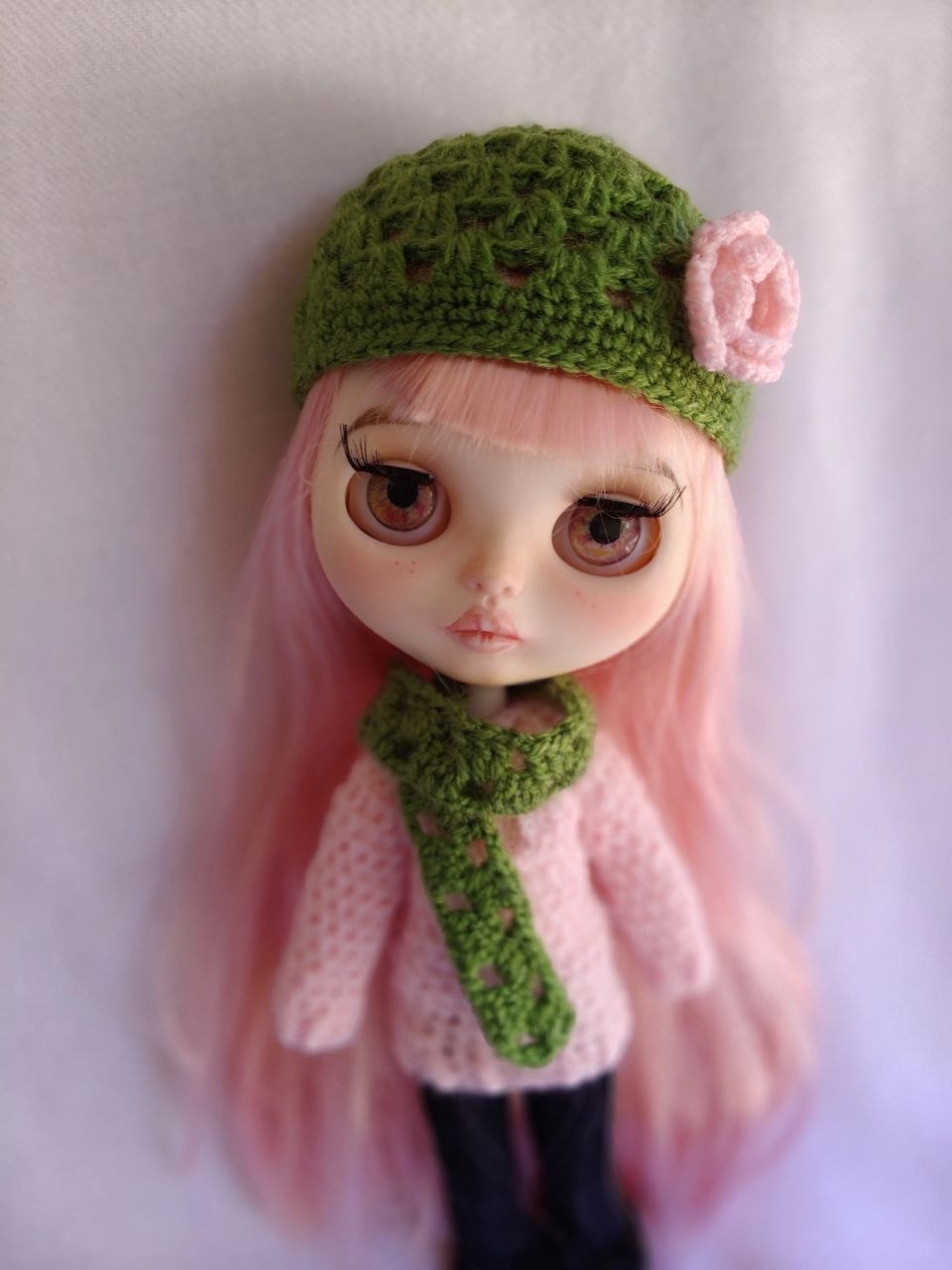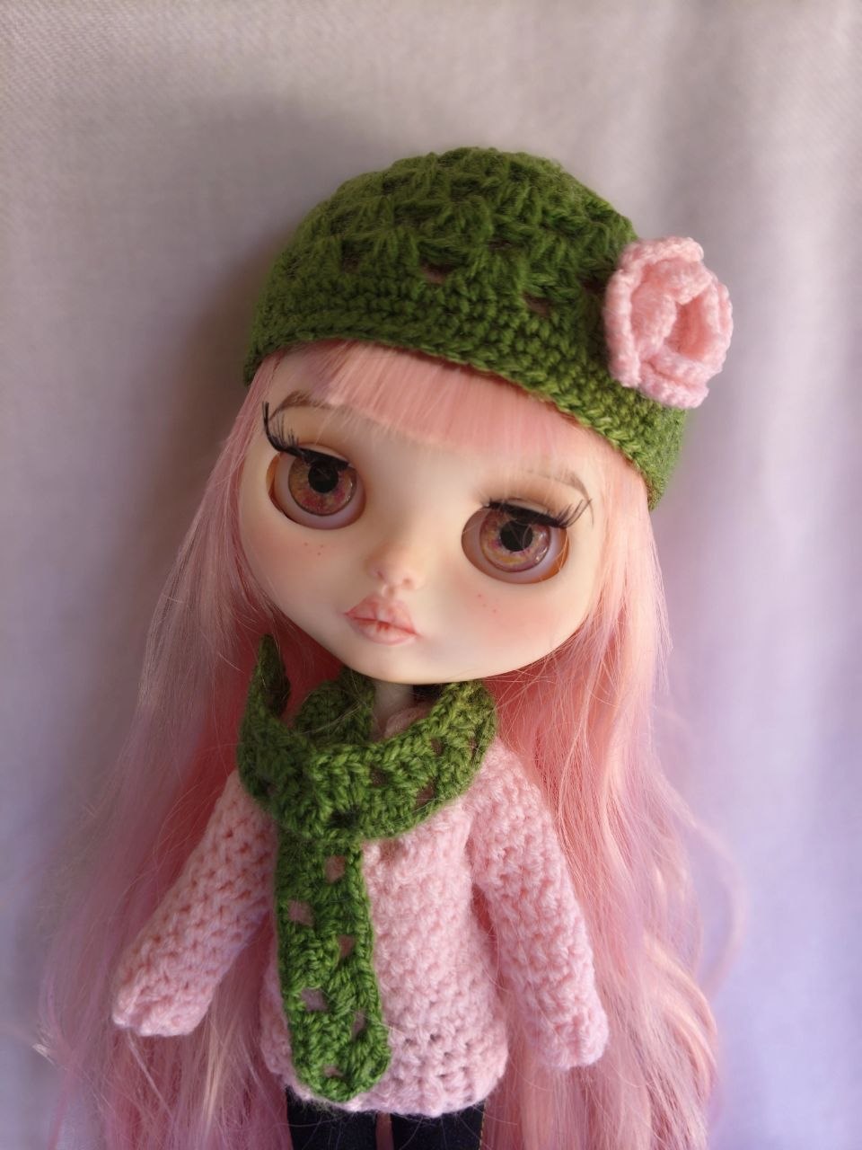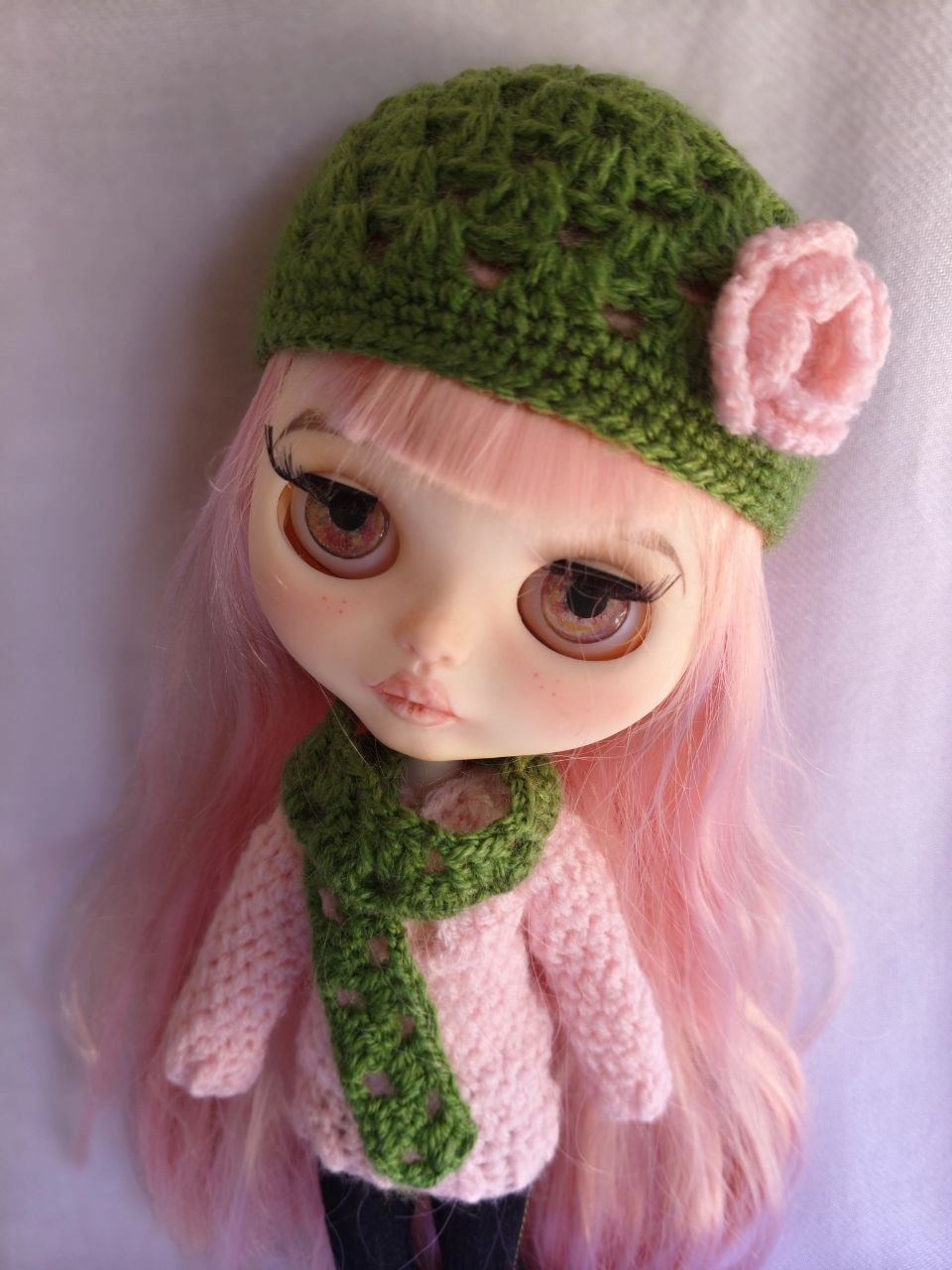 Hecho a mano en crochet. Precioso conjunto de gorro y bufanda de lana en crochet, decorado con una pequeña rosa, para muñeca Blythe y Pullip. Varios colores a elegir.
